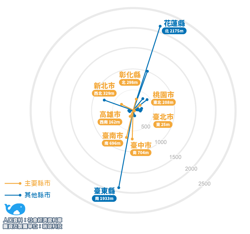 根據《地方制度法》的規定,在人口聚居達125萬人以上,在政治、經濟、文化及都會區域發展上有特殊需要之地區可設置為直轄市。因此此處定義主要縣市以取106年12月人口數達125萬以上的縣市,依兩時期人口重心偏移量進行排序彙整如下表1。其中彰化縣雖不是直轄市,但人口超過125萬,因此也列入分析;而臺北市這段時間人口重心偏移量變化較少,因此以下僅就臺中市、臺南市、新北市、彰化縣、桃園市、高雄市等六縣市依偏移量依序進行分析。此處仍先以雷達圖方式呈現所有縣市的人口重心偏移量及方向(如圖1),讓讀者掌握各縣市人口重心的偏移情況。