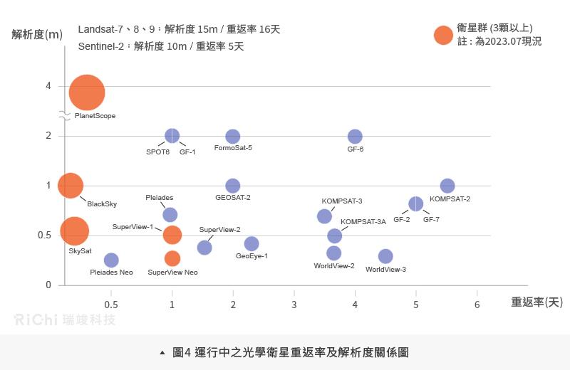 早期之衛星設計難以同時滿足高重返率及高解析度這兩個需求,但隨著地球變化越來越快速,衛星影像可應用的面向也越來越多元,為了獲得即時且詳細的地理資訊,監測頻率提高及高解析度的影像需求可說是勢在必行,現行運行之衛星重返率及解析度關係如圖4所示。