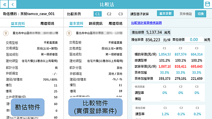 智慧型資產評估系統已完整整合了不動產估價、管理需要的各項功能,例如比較法需要一次比較多筆鄰近類似的案件,並分析生活或嫌惡設施分布狀況,作為估價參考因子。在系統中,我們首創使用不動產實價登錄資料自動配對模式,優先選出鄰近最類似的比較物件給估價師,大幅省去了過去人為查找資料、判斷條件的時間。